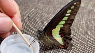 ペットボトルのキャップから餌を食べるアオスジアゲハ。