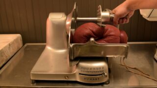 各用具を薄くスライスしていき、細長いパンで挟み込みます。