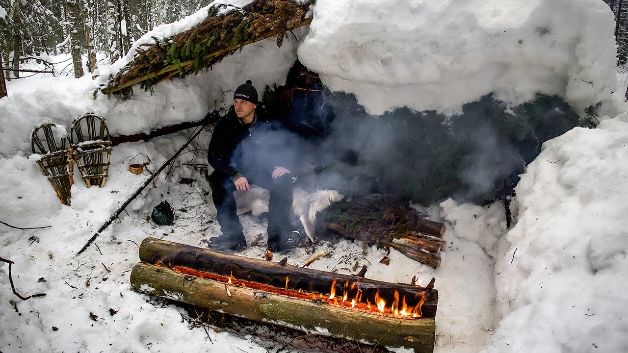 雪が積もりに積もってる冬の山でブッシュクラフトをする動画。