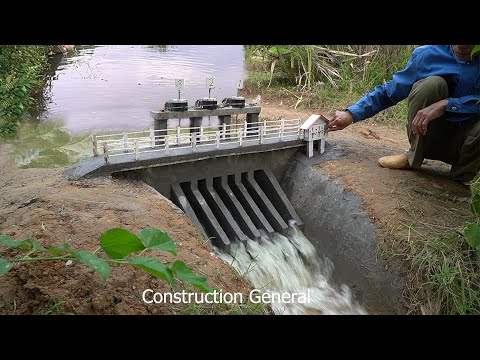 レンガを積んでコンクリートで覆ったミニダムを作る動画。