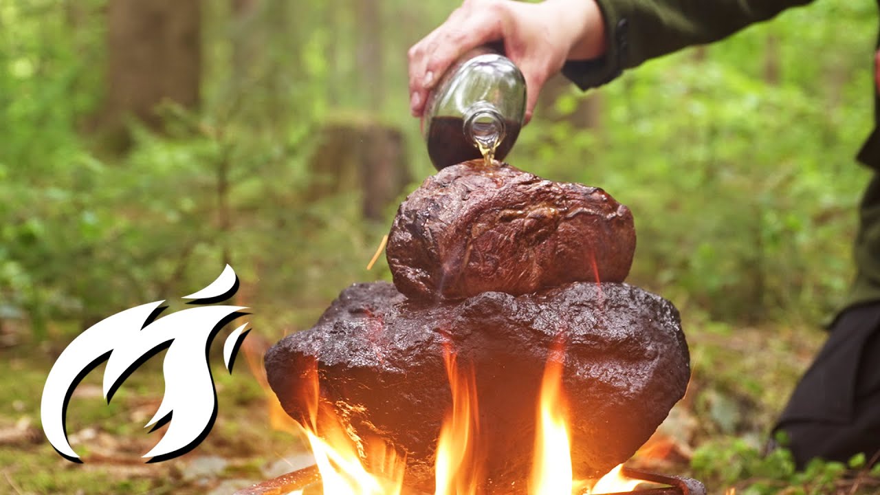 手のひらより大きい1kgのステーキの塊を森の中で調理する動画。