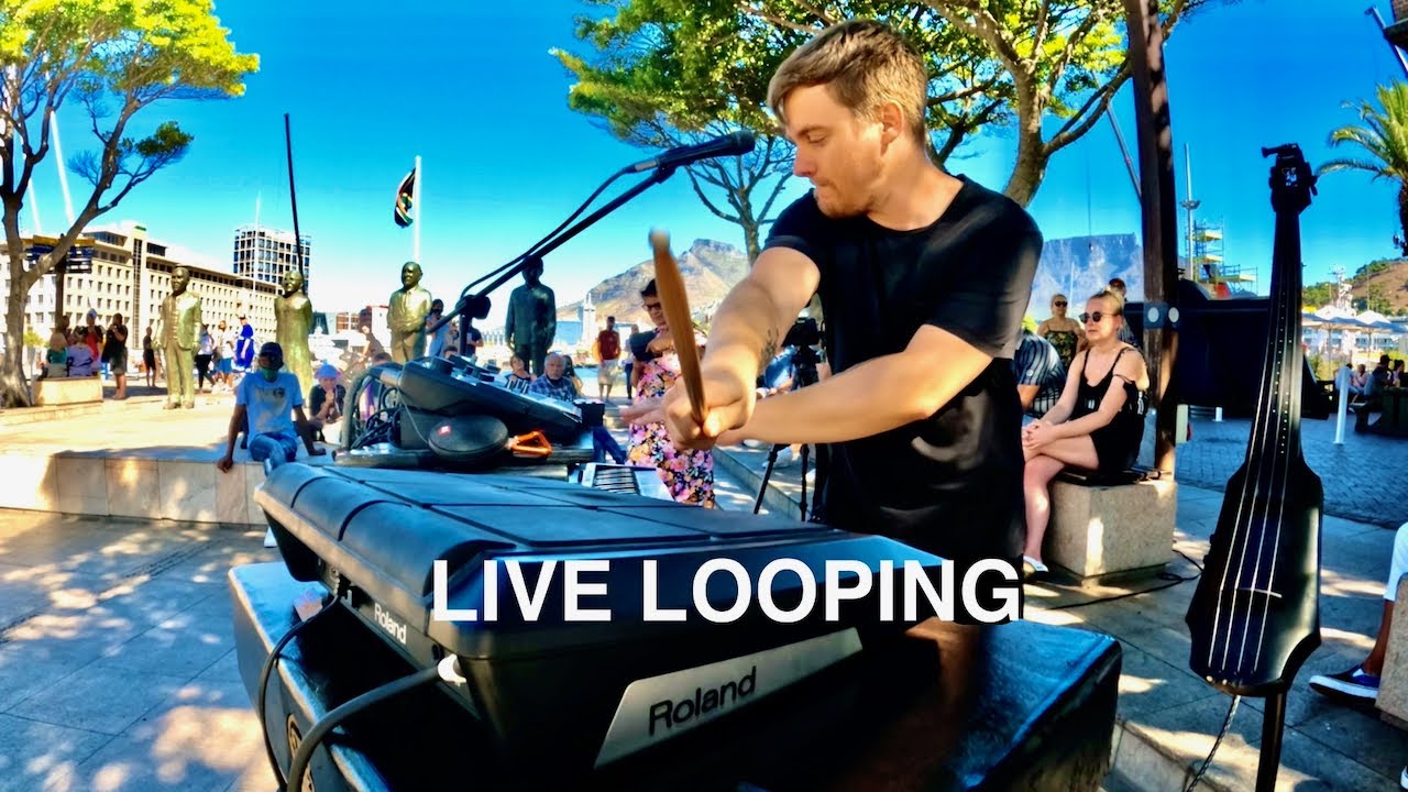 音楽電子チェロとループトラックやエフェクターを使った路上パフォーマンスの動画。
