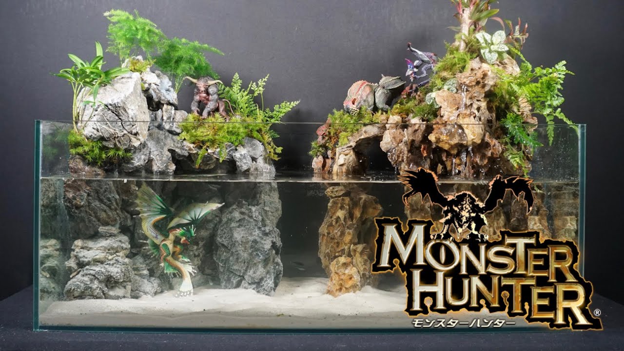 創作物モンスターハンターに登場するモンスターのフィギュアを使ったアクアリウムの制作動画。