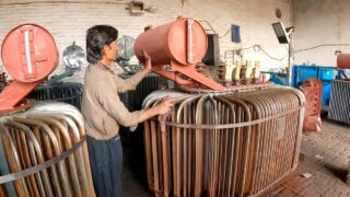 技術どこかの635kVA用の変圧器生産工場の様子。