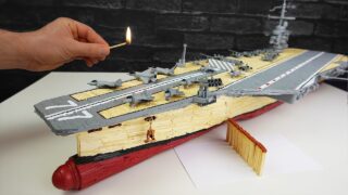 いくつもの空容器とマッチ棒を材料にした空母の制作動画。
