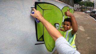 立体的な質感を持ったグラフィティが大きな壁にスプレーで描かれていきます。