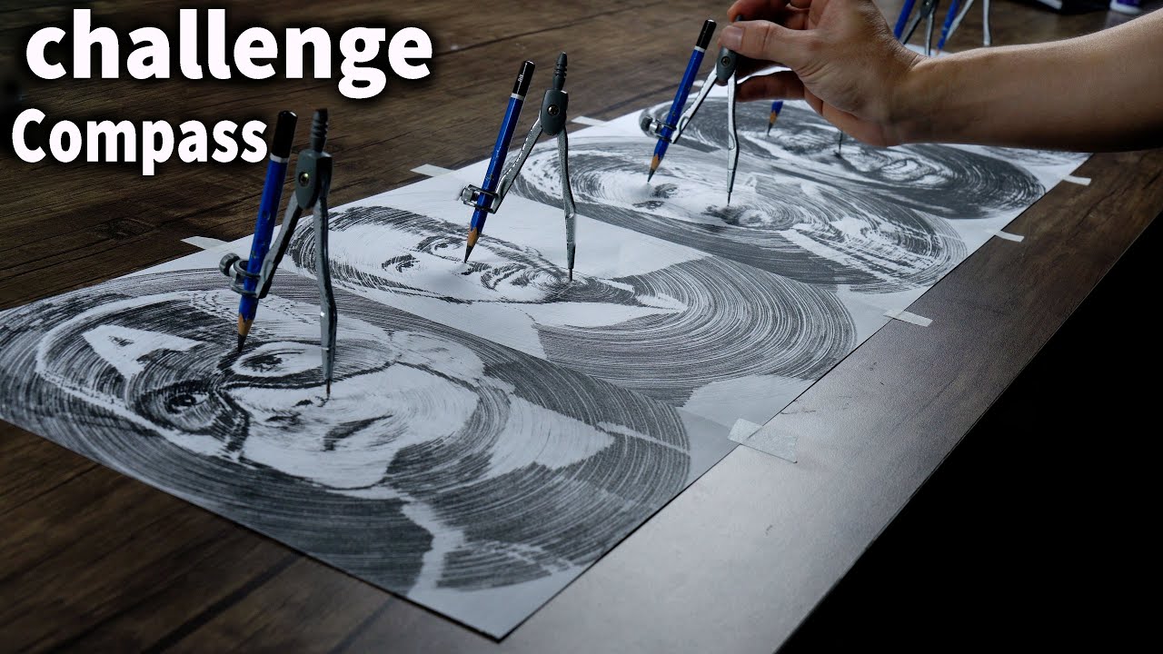 コンパスで一枚の紙に描かれていくアベンジャーズの似顔絵。