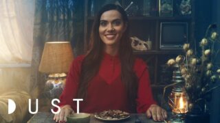テーブルの上の皿に盛られているのは庭で取れた新鮮なトマトと虫。