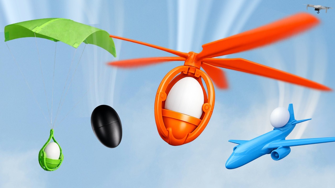 実験方法は衝撃吸収装置とともに卵をドローンで122mほど上昇。