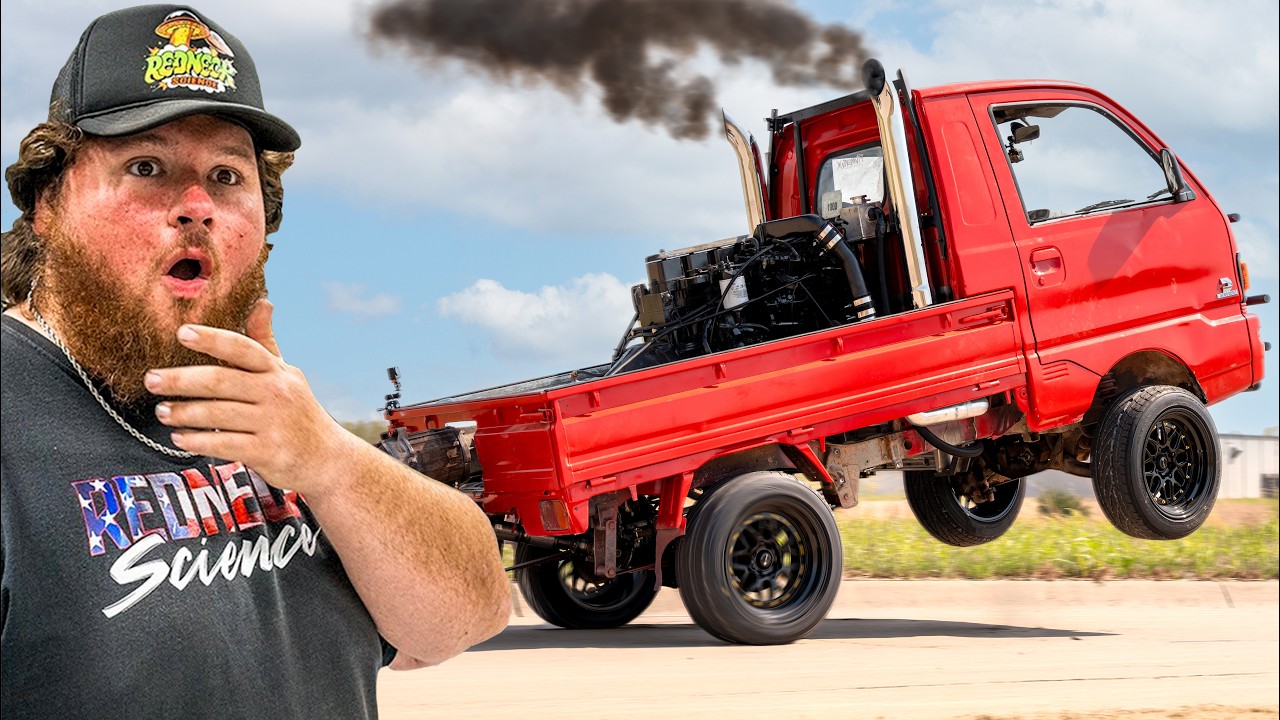小さな軽トラにでっかいディーゼルエンジンを乗せてみた改造動画。