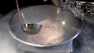 ソースにはグレープジュースとホイップクリームを混ぜたものを液体窒素の中へ。