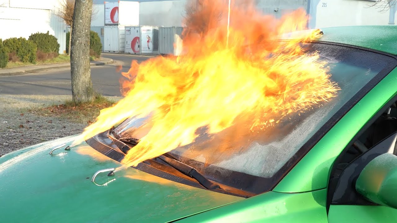 ダッシュボード下のスイッチを押せば本来ウォッシャー液が出るノズルからは炎が。