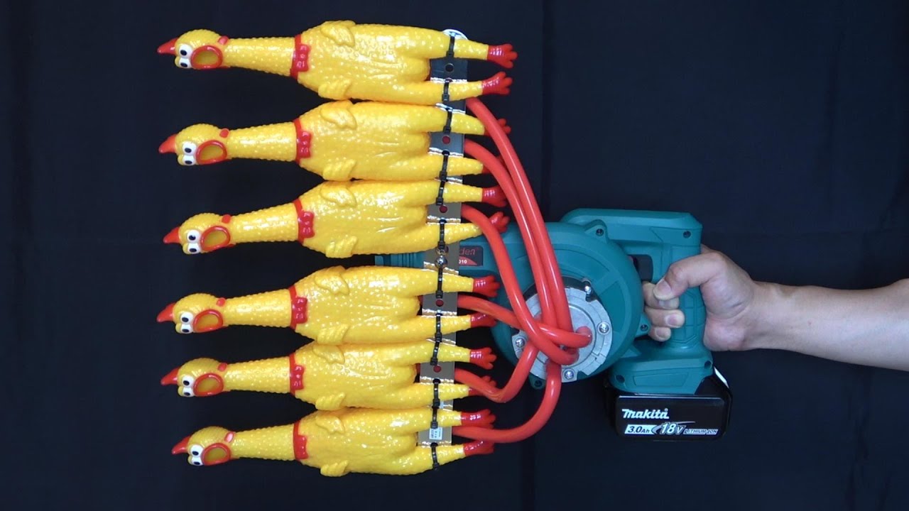 開口したチキンにホースを送入し、改造したブロワーから風を送り込むという方法です。