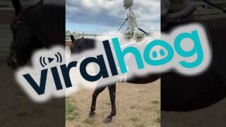 人体骨格模型を使って9歳のモーガン牝馬に乗馬の訓練をしている様子。