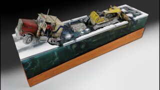 レジンとアクリル板で作る氷上を渡っている最中に水没したトラックのジオラマ。