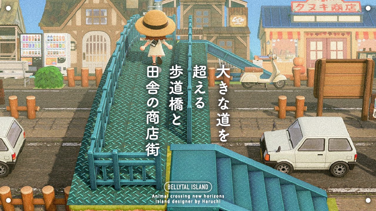 「あつまれ どうぶつの森」で歩道橋がある田舎道と商店街を作る制作動画。