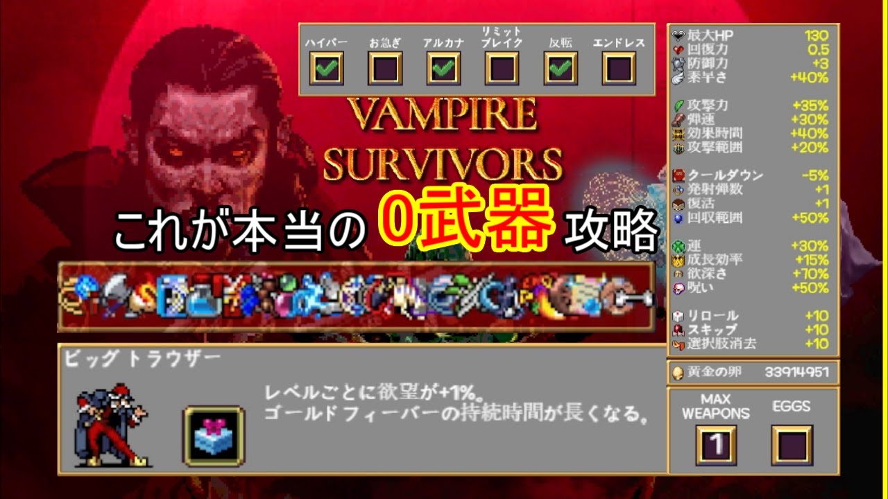 【Vampire Survivors】トラウザー 0武器反転ガロの塔攻略【字幕】