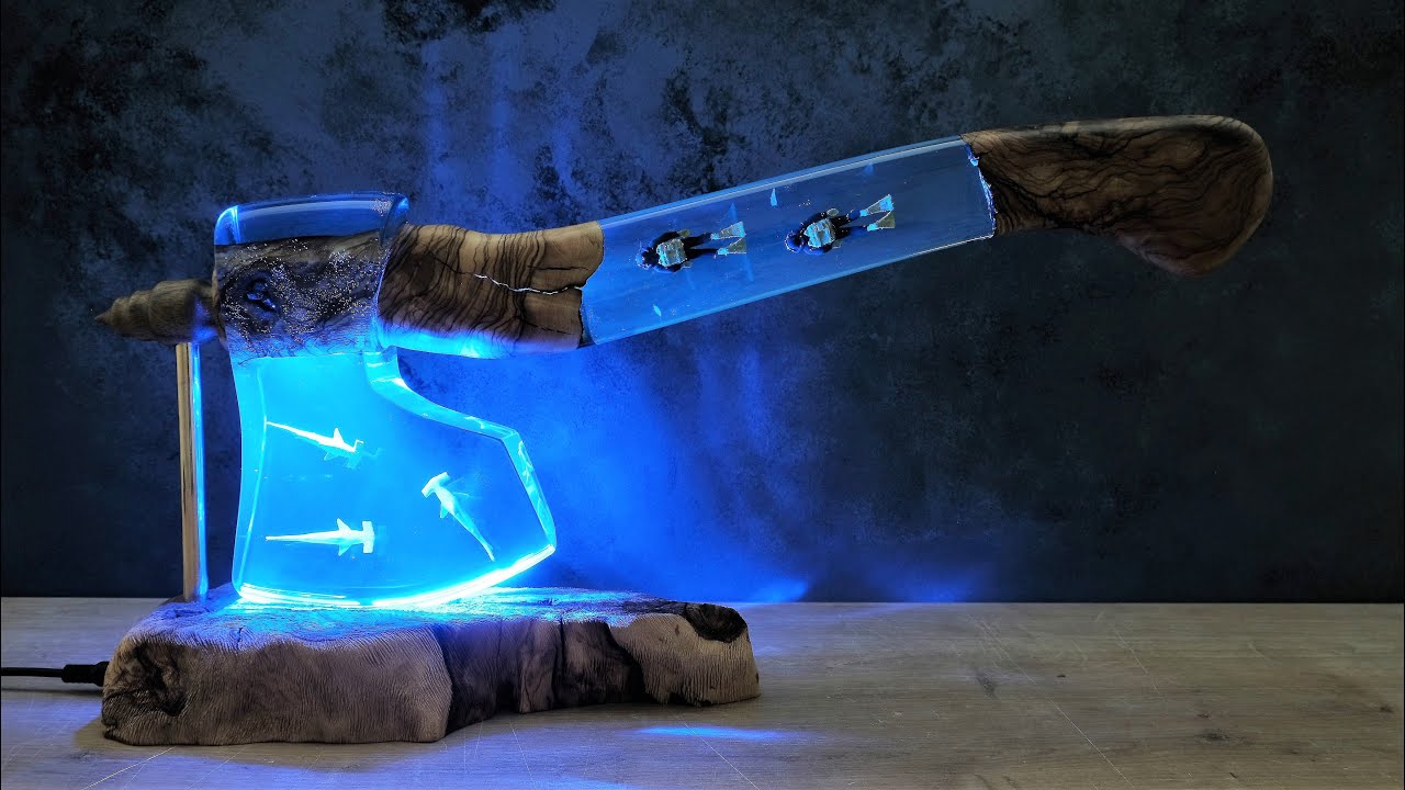 青く光る刃が美しい斧のナイトランプを制作する動画。