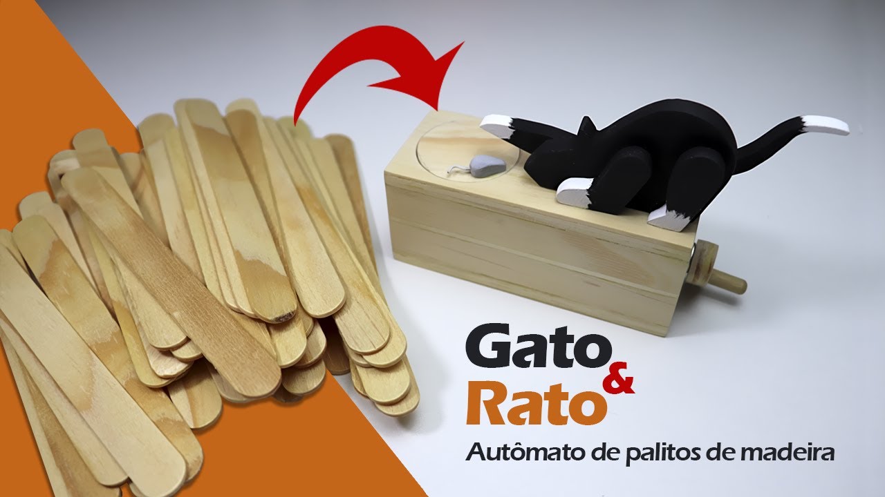 アイスの棒を素材にして作る黒猫がネズミを捕まえようとするオートマタの制作方法。