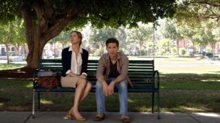 ベンチに座るお互いを知らない2人の男女。