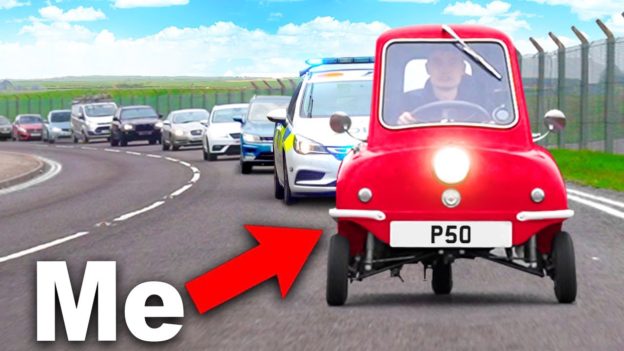 乗っている車はピール・エンジニアリング・カンパニー製三輪マイクロカー、P50。