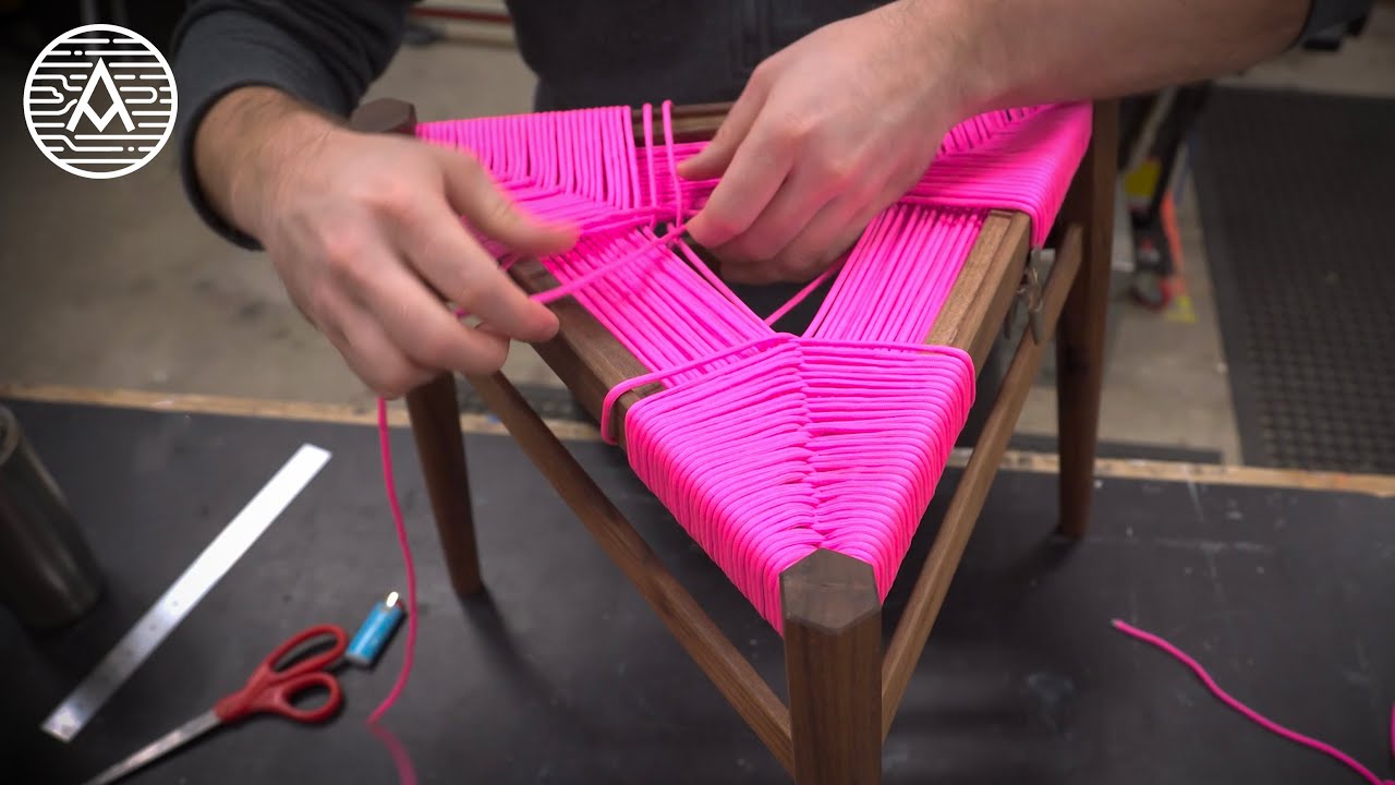 パラコードで編まれたシートが付いた三角形の入れ子スツールの制作動画。