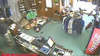 突然ゴルフショップの天井をぶち破り1階へと落ちてきた男性。