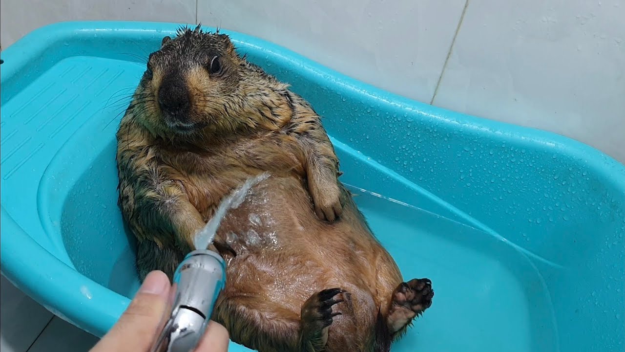 なすがままにシャワーをさせられるマーモットがかわいい動画。