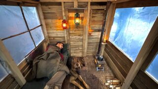 木の小屋をDIYして愛犬とともにキャンプをする動画。