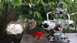 1気筒エンジンを組み合わせて水平対向エンジンに作り替えてみた動画。