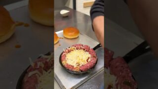 さらにそれを潰し、次にバンズを油に浸しこれにもチーズを乗せます。