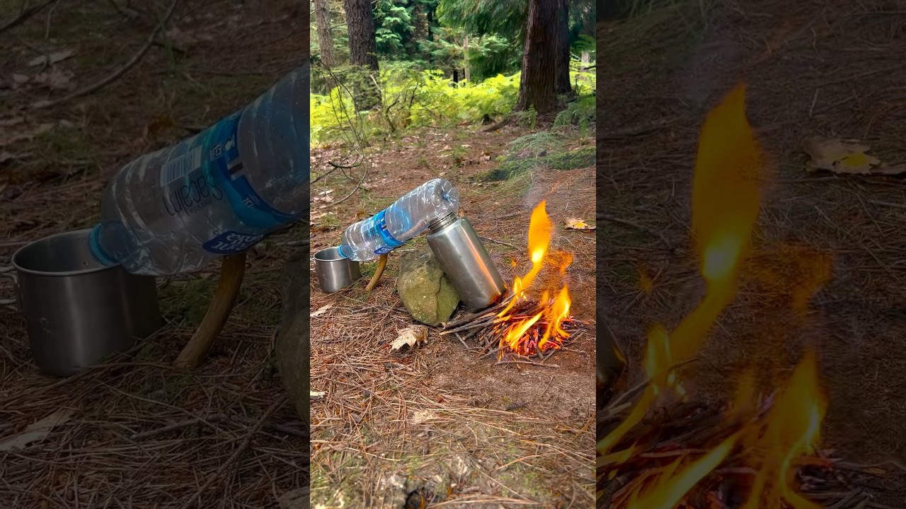 起こした火で水筒を温めれば水蒸気が発生。