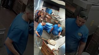挑戦していた店員はそれを手本にし再度ピザを乗せようとします。
