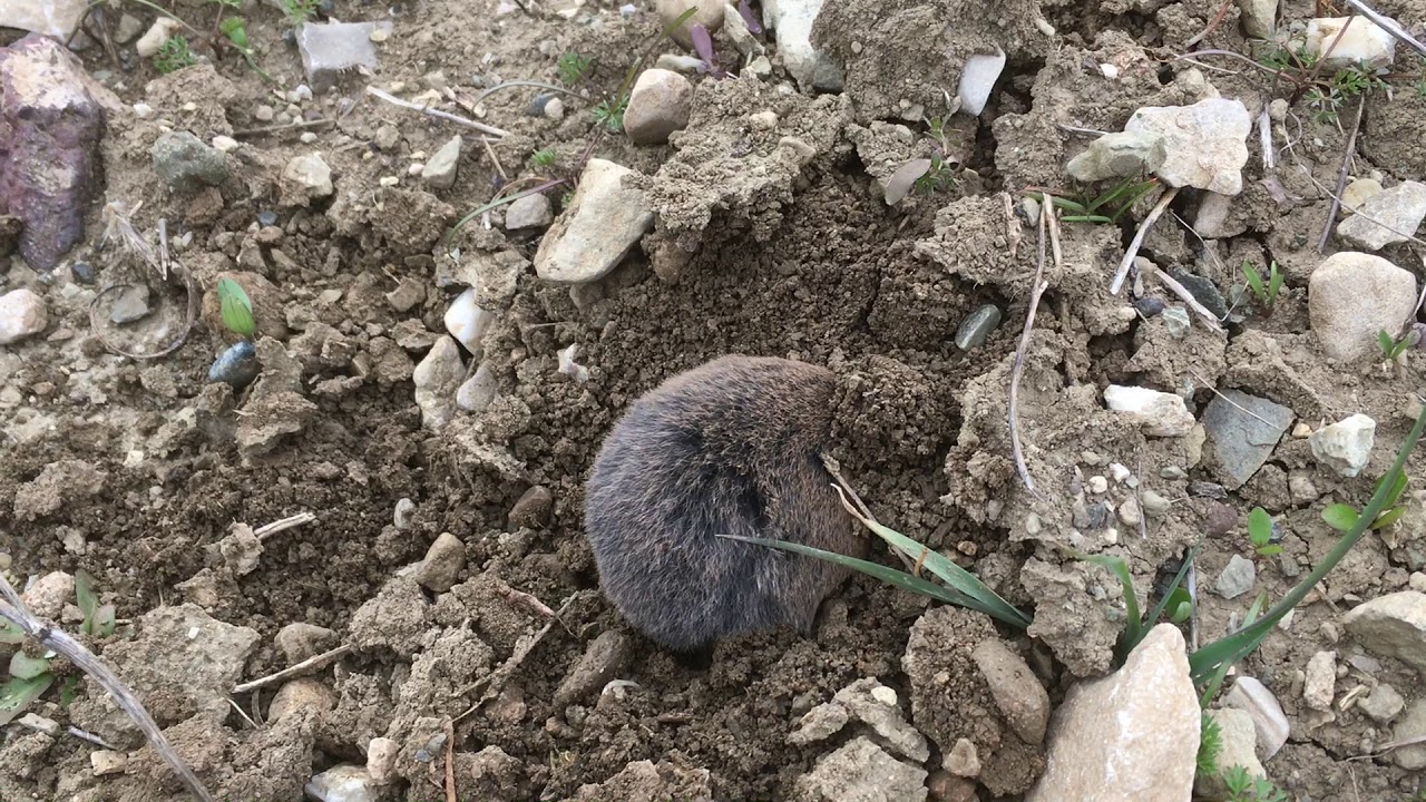野生のモグラが地面に穴を掘って潜っていく様子を撮影した映像。