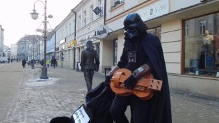 ダース・ベイダーのコスプレをしてハーディ・ガーディを演奏しているストリートミュージシャン。