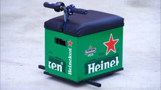 材料に使用したのはハイネケンのビールケースとミニバイク等に使われる小さいサイズのエンジン。