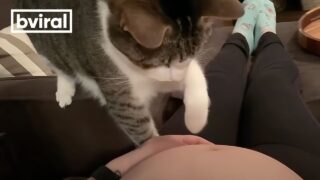 飼い主が妊娠して大きなおなかの中に新しい命が宿っていることに気づいた猫の反応がかわいい動画。
