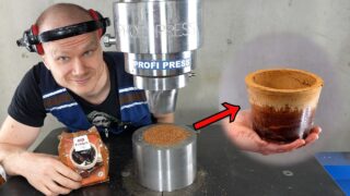 油圧プレスを使ってコーヒーの粉を圧縮したらコーヒーカップはできるのか実験してみた動画。