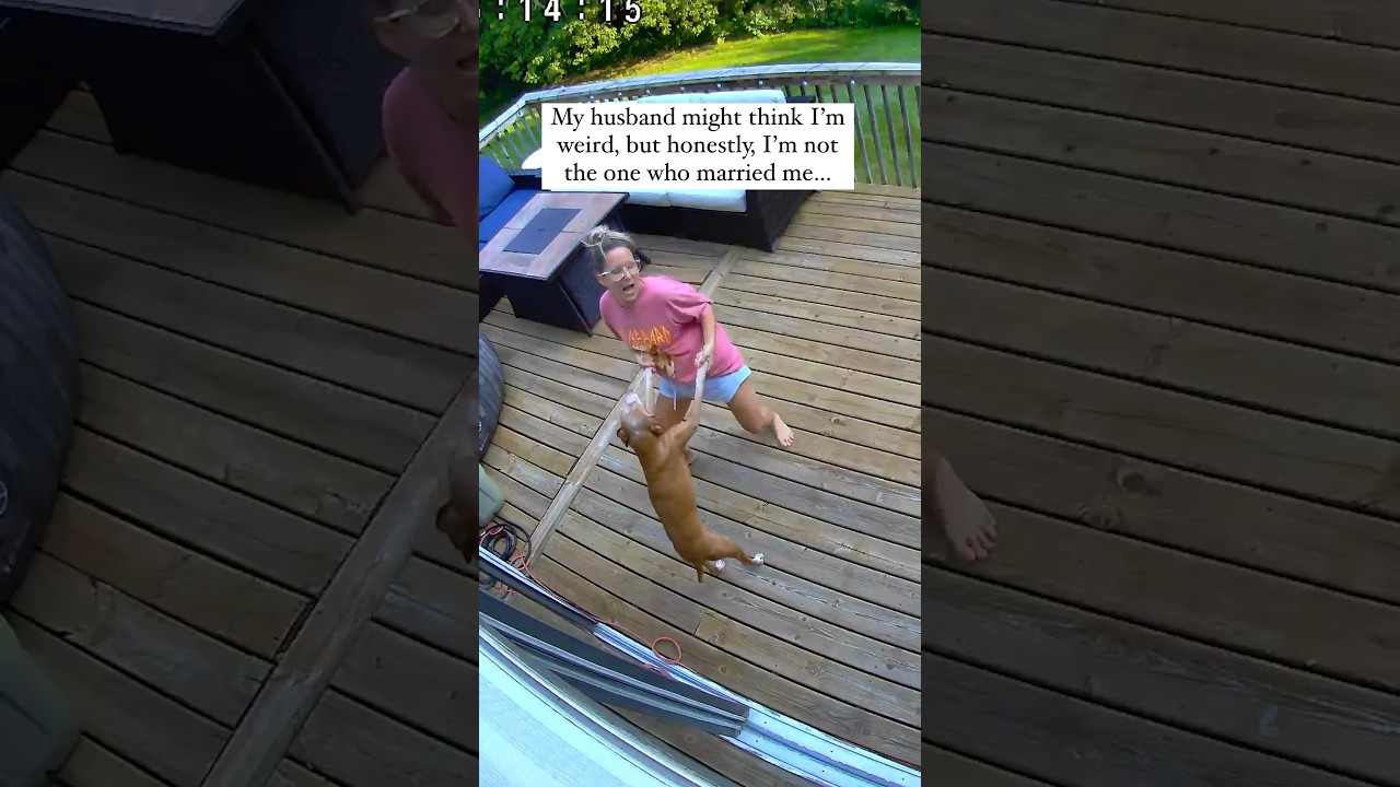 テラスで愛犬と一緒に楽しそうに踊っている妻。