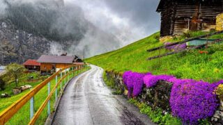 雨が降るスイスの村のギンメルヴァルトを散歩