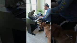 愛犬と愛猫と飼い主が一緒にピアノを弾いてみたショート。
