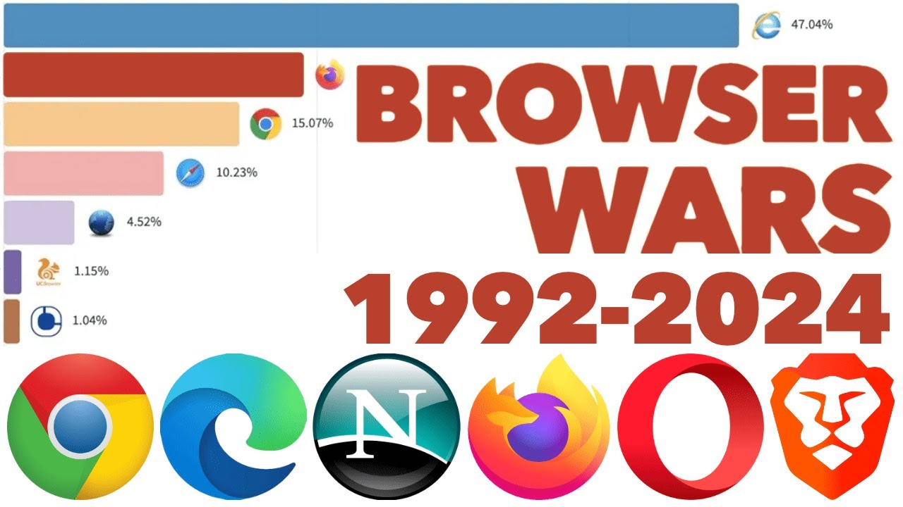1992年から2024年までのウェブブラウザのシェア率の変遷と比較のまとめ。