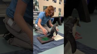 飼育員と一緒にアートな足跡を残すペンギンがかわいいショート。