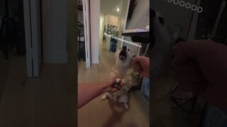 お手とおかわりを同時に要求され抗議の声をあげます。