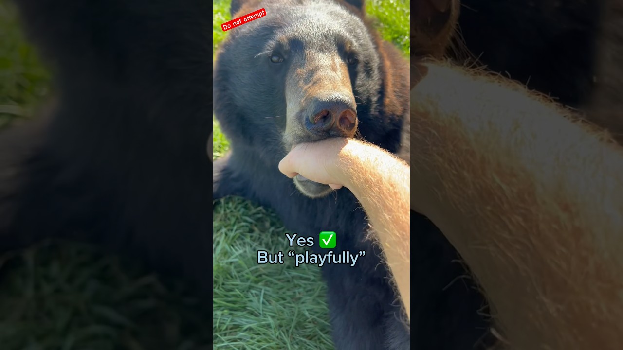クマのプーベアーは突き出した拳を甘噛み。