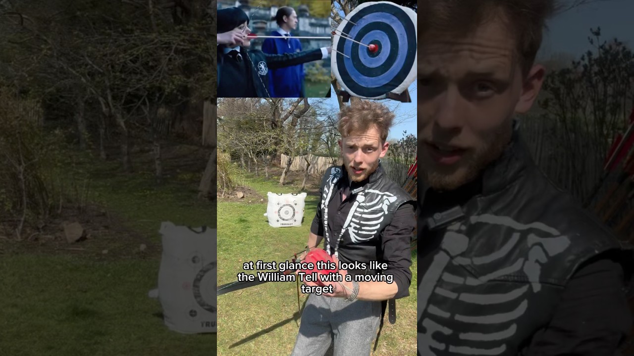 映画やウィリアム・テルのようにリンゴに矢を突き刺してさらに的に刺すことはできるのかの解説動画。