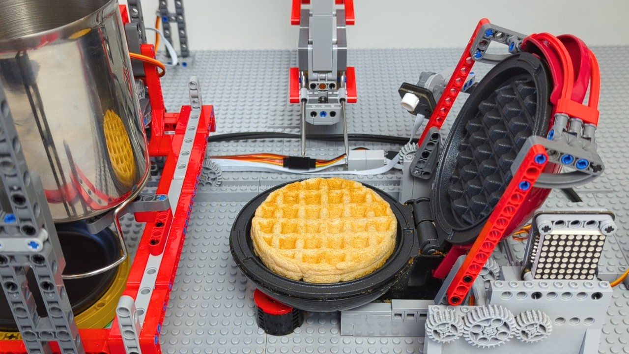 自動でワッフルを焼いてくれるレゴマシーンを作ってみた動画。