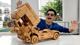 メルセデスベンツのトラックのミニチュアを木材で作ってみた動画。