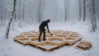 山の中にミツバチの巣箱のようなデザインの家を建ててみた動画。