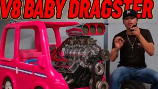 子どもが乗るようなバービーカーにV8エンジンを乗せてみた改造動画。